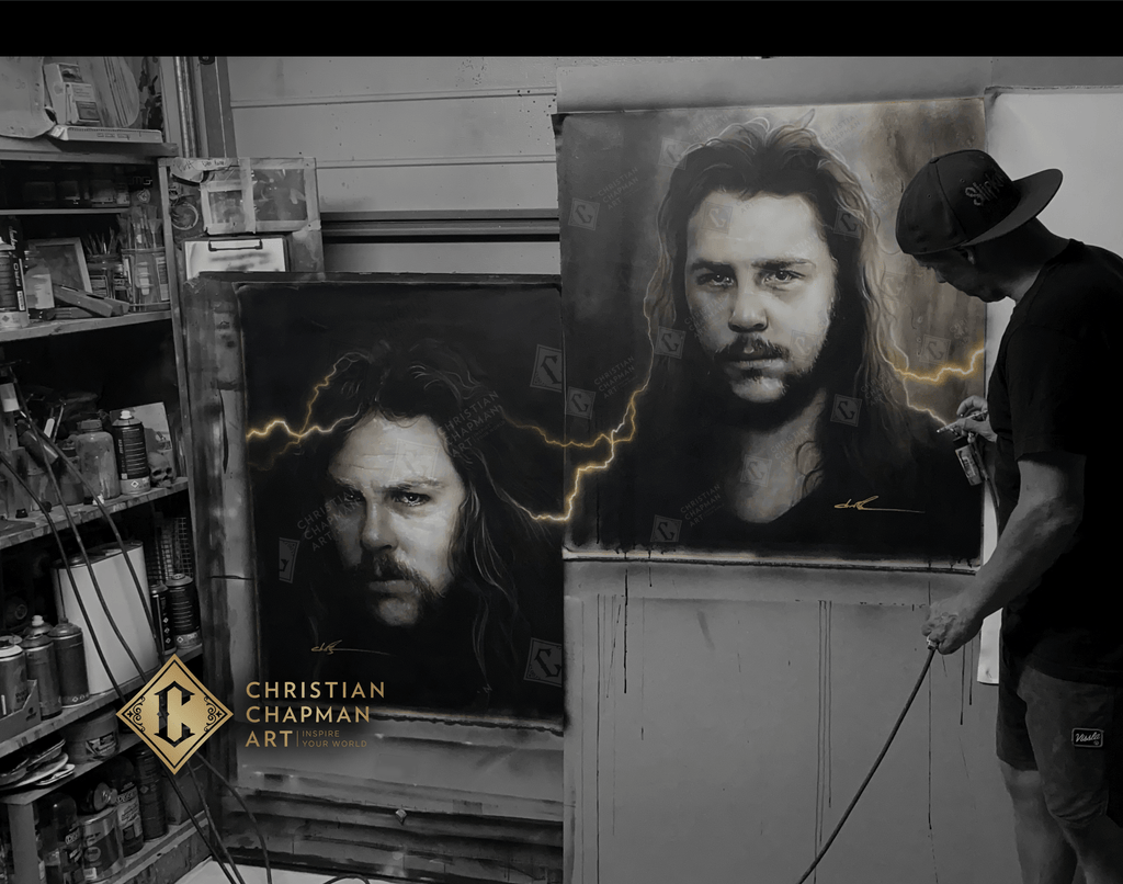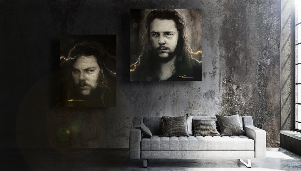 This painting is an original artwork of James Hetfield on framed canvas by Christian Chapman.