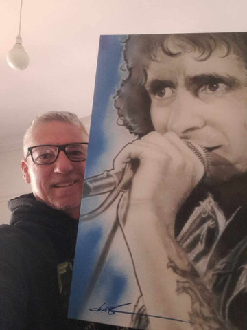 "People. If you love art do yourselves a favour. I had long been watching Christian create pieces, and became almost mesmerised by his uncanny ability to capture the essence of our 'Rock Idols'. Christians' heart and soul is delivered hands down in his work. I feel blessed to have Bon on my wall! Bons' eyes sealed the deal for me. Magic work! Will eventually be passed on to one of my kids. Thank you Christian for bringing joy, and an eternal conversation with mates over a beer, and a game of pool where Bon will hang. I want to be a rock n roll singer!🎶”